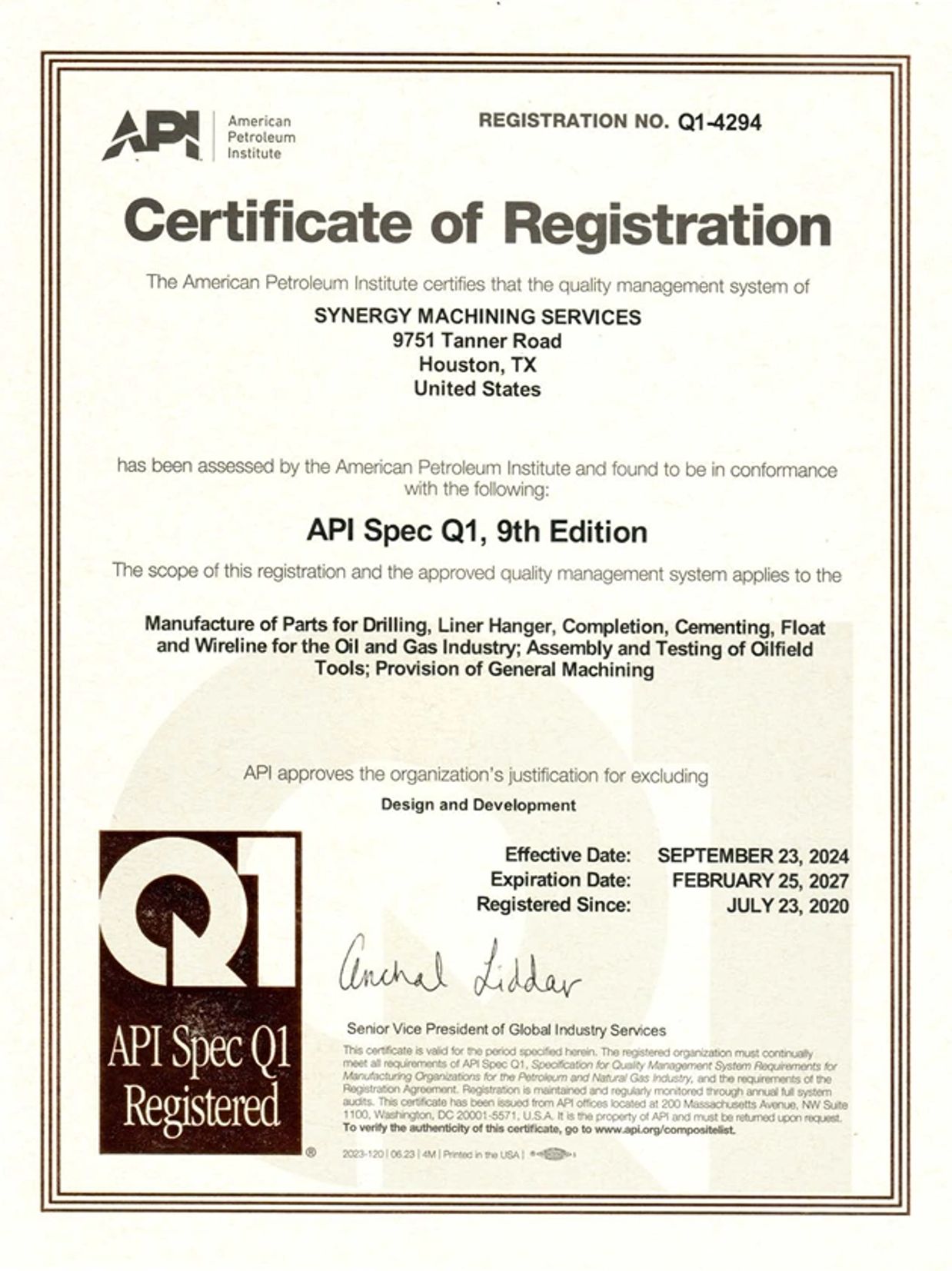 Synergy is an API Q1 certified facility. The QMS includes, quality manual (QM), Standard Operating Procedure (SOP), Quality Procedure (QP), Work Place Instruction(WPI), and forms. With the help of Synergy ERPMFG software, every manufactured parts has a full traceability, form purchasing, raw material to the time parts are at the customer location.
